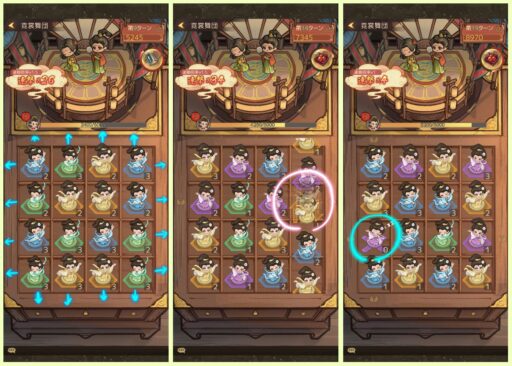 🔹盤面の人形は縦横に移動出来ます。動かすごとに動いた全ての人形(縦横いずれかの4体)の右上に表示された動かせる回数が減ります。